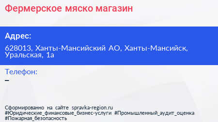 Фермерское мяско, магазин по адресу 628013, Ханты-Мансийский АО, Ханты-Мансийск, Уральская, 1а в дальнейшем Организация, размещена в следующих категориях: