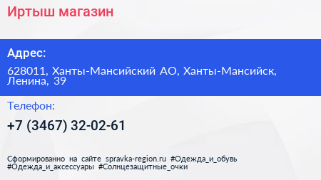 Иртыш, магазин по адресу 628011, Ханты-Мансийский АО, Ханты-Мансийск, Ленина, 39 в дальнейшем Организация, размещена в следующих категориях: