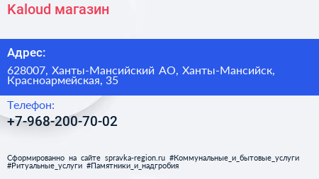 Kaloud, магазин по адресу 628007, Ханты-Мансийский АО, Ханты-Мансийск, Красноармейская, 35 в дальнейшем Организация, размещена в следующих категориях: