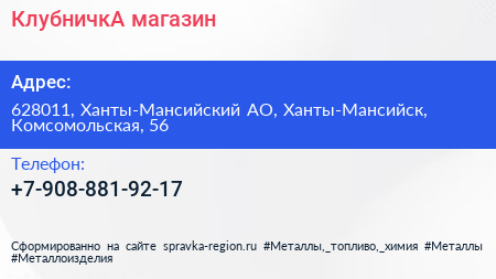 КлубничкА, магазин по адресу 628011, Ханты-Мансийский АО, Ханты-Мансийск, Комсомольская, 56 в дальнейшем Организация, размещена в следующих категориях: