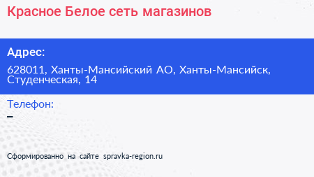 Красное & Белое, сеть магазинов по адресу 628011, Ханты-Мансийский АО, Ханты-Мансийск, Студенческая, 14 в дальнейшем Организация, размещена в следующих категориях: