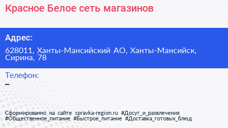 Красное & Белое, сеть магазинов по адресу 628011, Ханты-Мансийский АО, Ханты-Мансийск, Сирина, 78 в дальнейшем Организация, размещена в следующих категориях:
