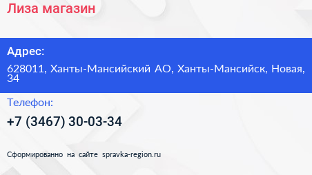 Лиза, магазин по адресу 628011, Ханты-Мансийский АО, Ханты-Мансийск, Новая, 34 в дальнейшем Организация, размещена в следующих категориях: