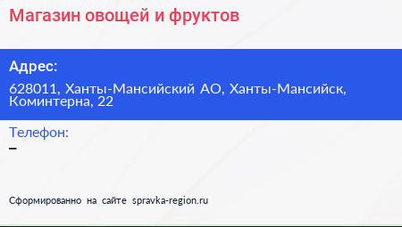 Магазин овощей и фруктов по адресу 628011, Ханты-Мансийский АО, Ханты-Мансийск, Коминтерна, 22 в дальнейшем Организация, размещена в следующих категориях: