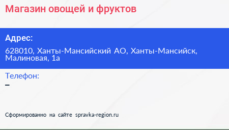 Магазин овощей и фруктов по адресу 628010, Ханты-Мансийский АО, Ханты-Мансийск, Малиновая, 1а в дальнейшем Организация, размещена в следующих категориях:
