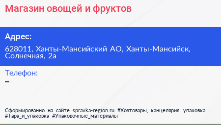 Магазин овощей и фруктов по адресу 628011, Ханты-Мансийский АО, Ханты-Мансийск, Солнечная, 2а в дальнейшем Организация, размещена в следующих категориях: