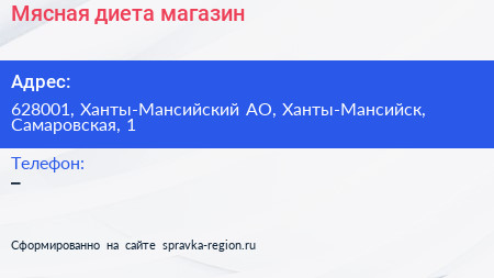 Мясная диета, магазин по адресу 628001, Ханты-Мансийский АО, Ханты-Мансийск, Самаровская, 1 в дальнейшем Организация, размещена в следующих категориях: