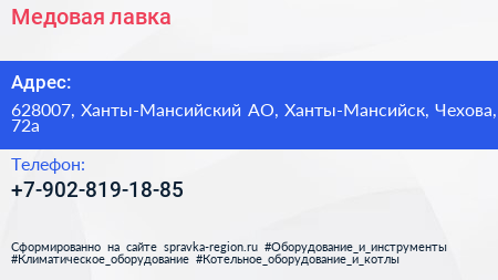 Медовая лавка по адресу 628007, Ханты-Мансийский АО, Ханты-Мансийск, Чехова, 72а в дальнейшем Организация, размещена в следующих категориях: