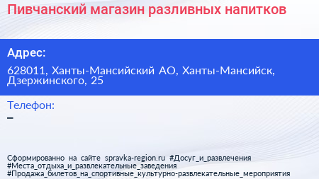 Пивчанский, магазин разливных напитков по адресу 628011, Ханты-Мансийский АО, Ханты-Мансийск, Дзержинского, 25 в дальнейшем Организация, размещена в следующих категориях: