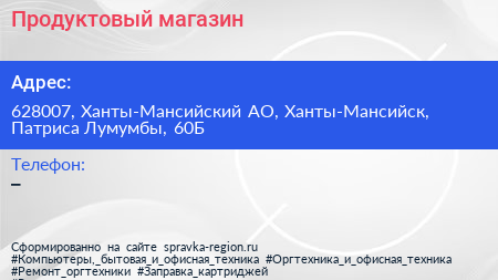 Продуктовый магазин по адресу 628007, Ханты-Мансийский АО, Ханты-Мансийск, Патриса Лумумбы, 60Б в дальнейшем Организация, размещена в следующих категориях: