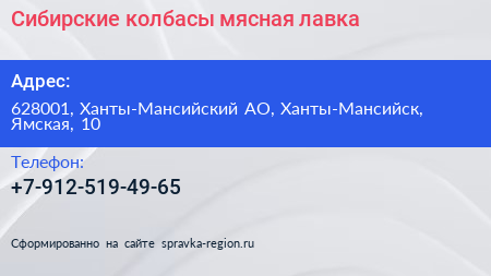 Сибирские колбасы, мясная лавка по адресу 628001, Ханты-Мансийский АО, Ханты-Мансийск, Ямская, 10 в дальнейшем Организация, размещена в следующих категориях: