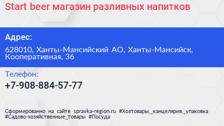 Start beer, магазин разливных напитков по адресу 628010, Ханты-Мансийский АО, Ханты-Мансийск, Кооперативная, 36 в дальнейшем Организация, размещена в следующих категориях: