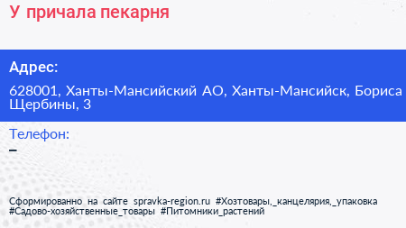 У причала, пекарня по адресу 628001, Ханты-Мансийский АО, Ханты-Мансийск, Бориса Щербины, 3 в дальнейшем Организация, размещена в следующих категориях: