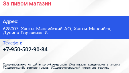 За пивом, магазин по адресу 628007, Ханты-Мансийский АО, Ханты-Мансийск, Дунина-Горкавича, 8 в дальнейшем Организация, размещена в следующих категориях:
