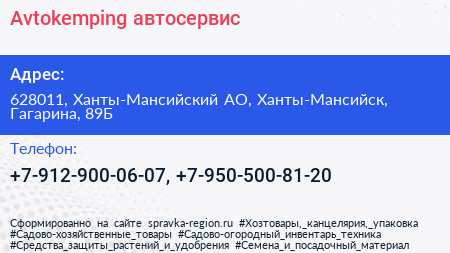 Avtokemping, автосервис по адресу 628011, Ханты-Мансийский АО, Ханты-Мансийск, Гагарина, 89Б в дальнейшем Организация, размещена в следующих категориях: