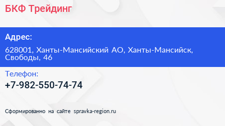БКФ Трейдинг по адресу 628001, Ханты-Мансийский АО, Ханты-Мансийск, Свободы, 46 в дальнейшем Организация, размещена в следующих категориях:
