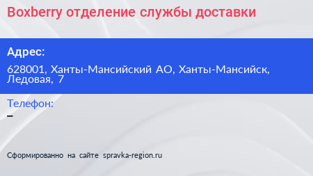 Boxberry, отделение службы доставки по адресу 628001, Ханты-Мансийский АО, Ханты-Мансийск, Ледовая, 7 в дальнейшем Организация, размещена в следующих категориях:
