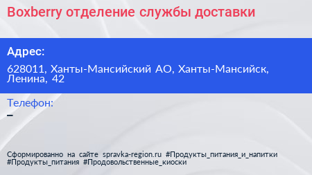 Boxberry, отделение службы доставки по адресу 628011, Ханты-Мансийский АО, Ханты-Мансийск, Ленина, 42 в дальнейшем Организация, размещена в следующих категориях: