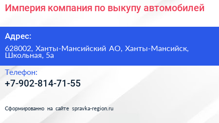 Империя, компания по выкупу автомобилей по адресу 628002, Ханты-Мансийский АО, Ханты-Мансийск, Школьная, 5а в дальнейшем Организация, размещена в следующих категориях:
