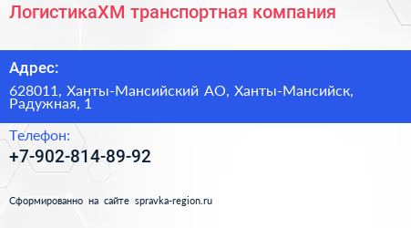 ЛогистикаХМ, транспортная компания по адресу 628011, Ханты-Мансийский АО, Ханты-Мансийск, Радужная, 1 в дальнейшем Организация, размещена в следующих категориях: