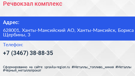 Речвокзал, комплекс по адресу 628001, Ханты-Мансийский АО, Ханты-Мансийск, Бориса Щербины, 3 в дальнейшем Организация, размещена в следующих категориях: