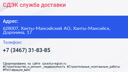 СДЭК, служба доставки по адресу 628007, Ханты-Мансийский АО, Ханты-Мансийск, Доронина, 17 в дальнейшем Организация, размещена в следующих категориях: