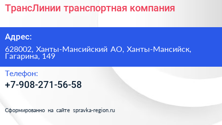 ТрансЛинии, транспортная компания по адресу 628002, Ханты-Мансийский АО, Ханты-Мансийск, Гагарина, 149 в дальнейшем Организация, размещена в следующих категориях: