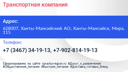 Транспортная компания по адресу 628007, Ханты-Мансийский АО, Ханты-Мансийск, Мира, 115 в дальнейшем Организация, размещена в следующих категориях: