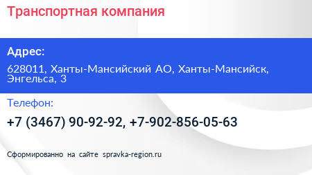 Транспортная компания по адресу 628011, Ханты-Мансийский АО, Ханты-Мансийск, Энгельса, 3 в дальнейшем Организация, размещена в следующих категориях: