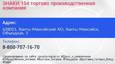 ЗНАКИ 154, торгово-производственная компания по адресу 628011, Ханты-Мансийский АО, Ханты-Мансийск, Объездная, 3 в дальнейшем Организация, размещена в следующих категориях: