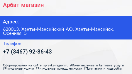 Арбат, магазин по адресу 628013, Ханты-Мансийский АО, Ханты-Мансийск, Осенняя, 5 в дальнейшем Организация, размещена в следующих категориях: