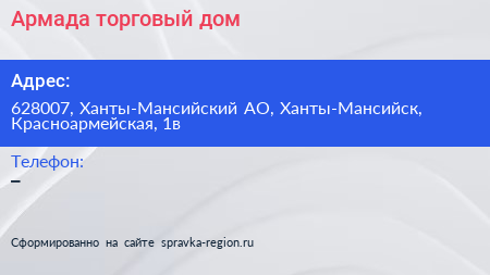 Армада, торговый дом по адресу 628007, Ханты-Мансийский АО, Ханты-Мансийск, Красноармейская, 1в в дальнейшем Организация, размещена в следующих категориях: