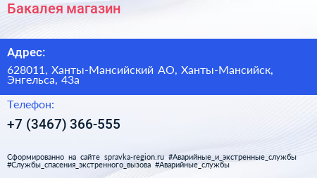 Бакалея, магазин по адресу 628011, Ханты-Мансийский АО, Ханты-Мансийск, Энгельса, 43а в дальнейшем Организация, размещена в следующих категориях: