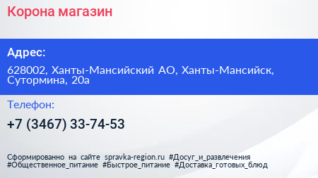 Корона, магазин по адресу 628002, Ханты-Мансийский АО, Ханты-Мансийск, Сутормина, 20а в дальнейшем Организация, размещена в следующих категориях: