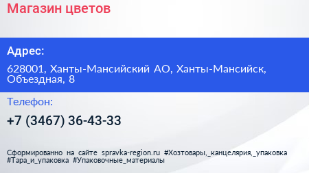 Магазин цветов по адресу 628001, Ханты-Мансийский АО, Ханты-Мансийск, Объездная, 8 в дальнейшем Организация, размещена в следующих категориях: