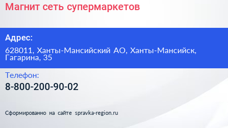 Магнит, сеть супермаркетов по адресу 628011, Ханты-Мансийский АО, Ханты-Мансийск, Гагарина, 35 в дальнейшем Организация, размещена в следующих категориях: