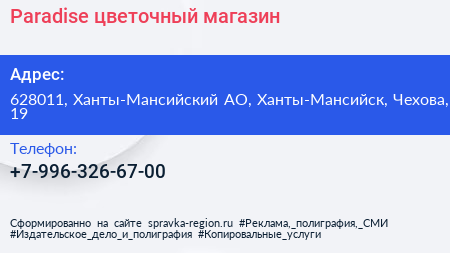 Paradise, цветочный магазин по адресу 628011, Ханты-Мансийский АО, Ханты-Мансийск, Чехова, 19 в дальнейшем Организация, размещена в следующих категориях: