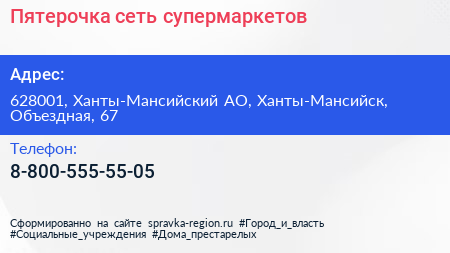 Пятерочка, сеть супермаркетов по адресу 628001, Ханты-Мансийский АО, Ханты-Мансийск, Объездная, 67 в дальнейшем Организация, размещена в следующих категориях: