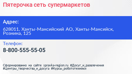 Пятерочка, сеть супермаркетов по адресу 628011, Ханты-Мансийский АО, Ханты-Мансийск, Рознина, 125 в дальнейшем Организация, размещена в следующих категориях: