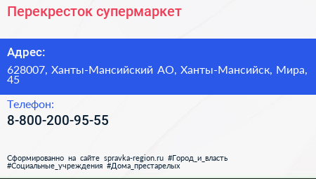 Перекресток, супермаркет по адресу 628007, Ханты-Мансийский АО, Ханты-Мансийск, Мира, 45 в дальнейшем Организация, размещена в следующих категориях: