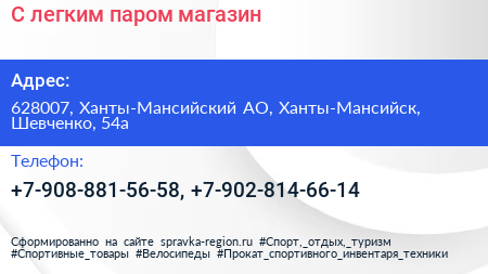 С легким паром, магазин по адресу 628007, Ханты-Мансийский АО, Ханты-Мансийск, Шевченко, 54а в дальнейшем Организация, размещена в следующих категориях: