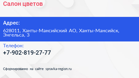 Салон цветов по адресу 628011, Ханты-Мансийский АО, Ханты-Мансийск, Энгельса, 3 в дальнейшем Организация, размещена в следующих категориях: