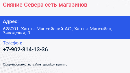 Сияние Севера, сеть магазинов по адресу 628001, Ханты-Мансийский АО, Ханты-Мансийск, Заводская, 3 в дальнейшем Организация, размещена в следующих категориях: