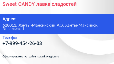 Sweet CANDY, лавка сладостей по адресу 628011, Ханты-Мансийский АО, Ханты-Мансийск, Энгельса, 1 в дальнейшем Организация, размещена в следующих категориях: