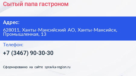 Сытый папа, гастроном по адресу 628011, Ханты-Мансийский АО, Ханты-Мансийск, Промышленная, 13 в дальнейшем Организация, размещена в следующих категориях: