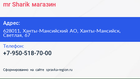 mr.Sharik, магазин по адресу 628011, Ханты-Мансийский АО, Ханты-Мансийск, Светлая, 67 в дальнейшем Организация, размещена в следующих категориях: