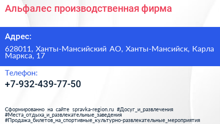 Альфалес, производственная фирма по адресу 628011, Ханты-Мансийский АО, Ханты-Мансийск, Карла Маркса, 17 в дальнейшем Организация, размещена в следующих категориях: