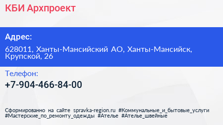 КБИ Архпроект по адресу 628011, Ханты-Мансийский АО, Ханты-Мансийск, Крупской, 26 в дальнейшем Организация, размещена в следующих категориях: