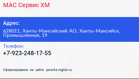 МАС-Сервис ХМ по адресу 628011, Ханты-Мансийский АО, Ханты-Мансийск, Промышленная, 19 в дальнейшем Организация, размещена в следующих категориях: