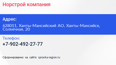 Норстрой, компания по адресу 628011, Ханты-Мансийский АО, Ханты-Мансийск, Солнечная, 20 в дальнейшем Организация, размещена в следующих категориях: